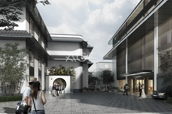 該項目的大門右邊外墻上有很明顯的星程酒店的logo,白底黑字辨識度很高,方便客人尋找。大門主題外墻以白色為主色,灰色線條壓邊,目的一是為了與酒店內部色彩一致,二是白墻灰瓦的顏色給人干凈的感覺,同時與周邊的山水風景融為一體,沒有突兀感。大門可直接通過車輛,方便客人直達酒店,院內可停車,方便自駕游的客人。大門頂部做出了延伸,采用玻璃做頂面覆蓋,方便客人遮風擋雨,同時增加光線。
